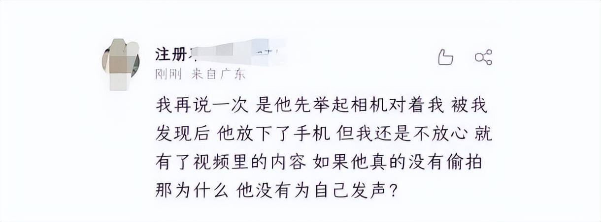 “我再说一次,是他先举起相机对着我,被我发现后他放下了手机,但我还是不放心,就有了视频里的内容,如果他真的没有偷拍,那为什么他没有为自己发声?”