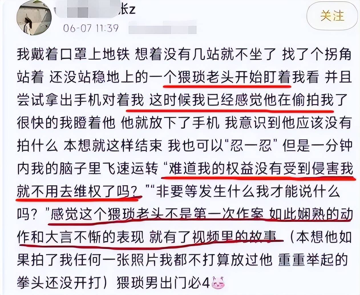 “感觉这个猥琐老头不是第一次作案,如此娴熟的动作和大言不惭的表现,就有了视频里的故事(本想他如果拍了我任何一张照片,我都不打算放过他,重重举起的拳头还没开打)猥琐男出门必死”。