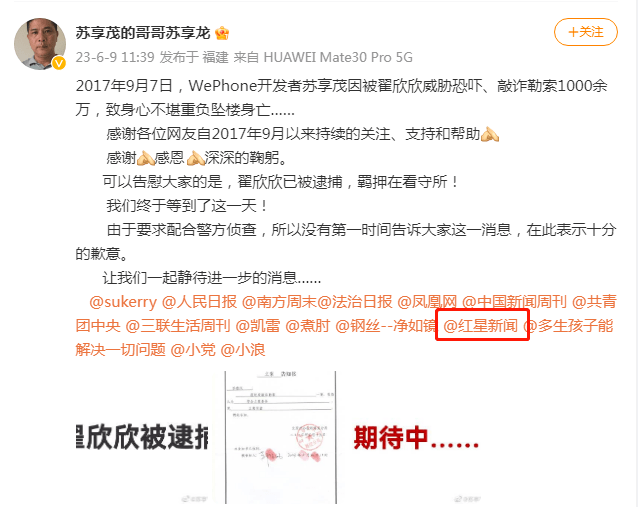 ↑苏享茂哥哥苏享龙发布微博称,翟欣欣已被逮捕