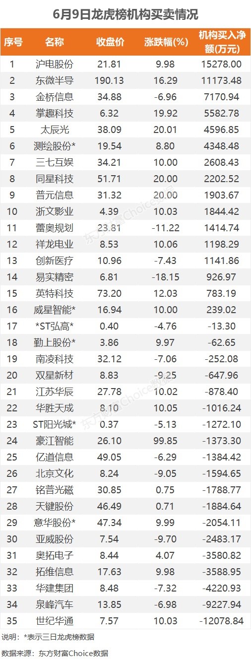 机构参与龙虎榜中个股共涉及35股,其中16股被机构净买入,沪电股份被买入最多,为1.53亿元。另外19股被机构净卖出,世纪华通被卖出最多,为1.21亿元。