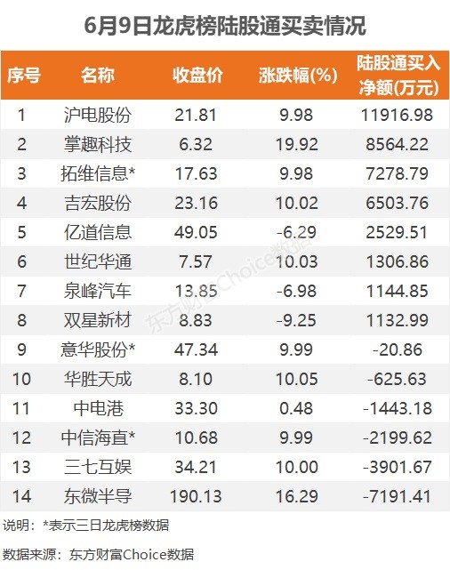 陆股通参与龙虎榜中个股共涉及14股,其中8股被陆股通净买入,除前述沪电股份外,掌趣科技也被陆股通净买入较多,为8564.22万元。另外6股被陆股通净卖出,东微半导被卖出最多,为7191.41万元。