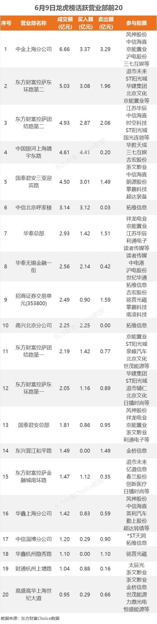 从活跃营业部角度来看,中金上海分公司日内成交6.66亿元,参与了风神股份、中信海直、京能置业、沪电股份、三七互娱等股票。华泰总部日内成交2.93亿元,参与了祥龙电业、京能置业、江苏华辰、利通电子、读者传媒等股票。招商证券交易单元日内成交2.49亿元,参与了拓维信息、吉宏股份、铭普光磁、掌趣科技、南凌科技。