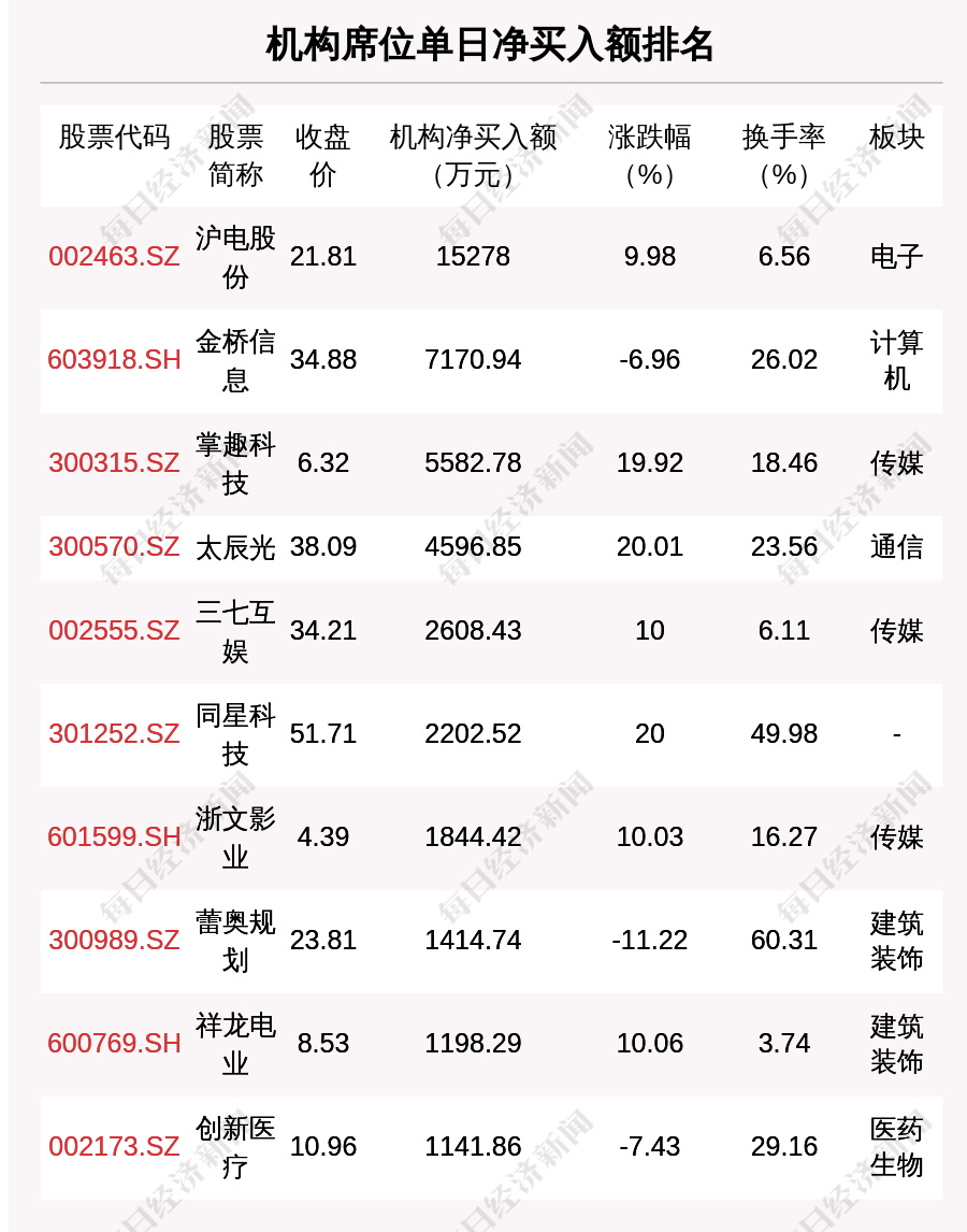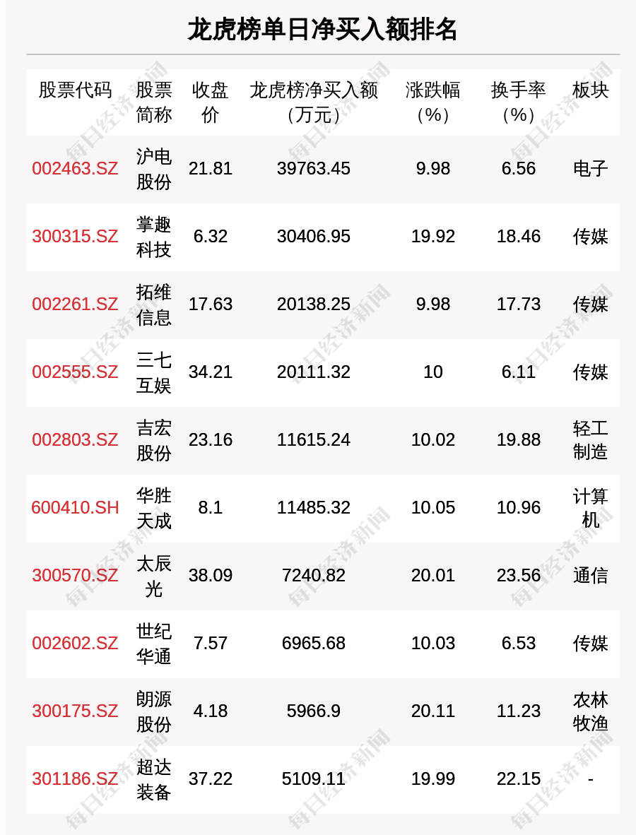 在龙虎榜中,涉及机构专用席位的个股有26只,净买入额前三的是沪电股份、金桥信息、掌趣科技,分别为1.53亿元、7170.94万元、5582.78万元。