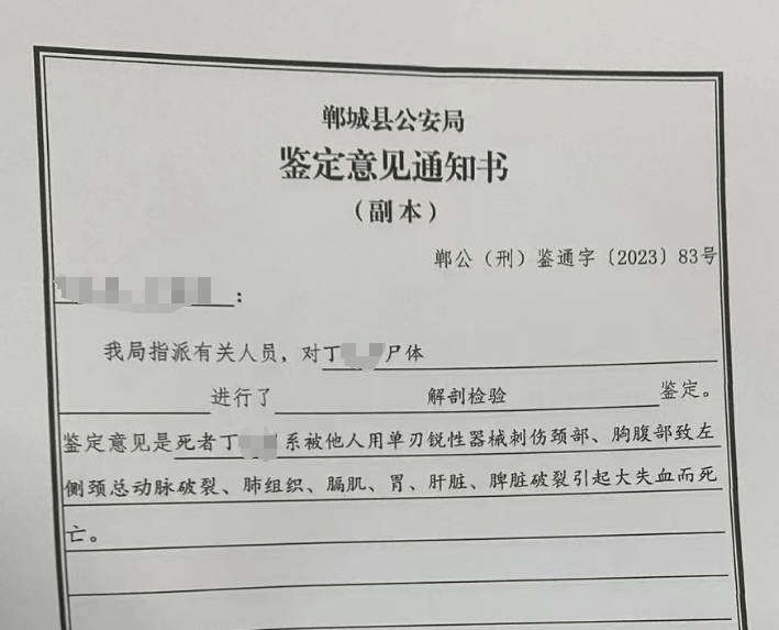 郸城县公安局提供的鉴定意见通知书显示,丁小露的父亲和妹妹均系被他人用单刃锐性器械刺伤多处引起大失血而死亡。