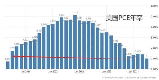 数据显示,美国10月PCE同比涨幅为3%(预期3%),继续处于稳步下降的状态。与此同时,去除食品和能源价格的核心PCE年率四舍五入后也下降至3.5%(预期3.5%)。这两项数据均为2021年4月以来的最低值。