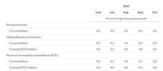 除了价格变化外,PCE数据也包含了消费者收入和支出数据。美国10月个人收入和支出的月环比变动都是0.2%(均与预期一致),前值分别为0.3%和0.7%。收入和支出的增幅下滑,也展现出美国消费者面对“超额储蓄见底”、重启偿还学生贷款的影响。