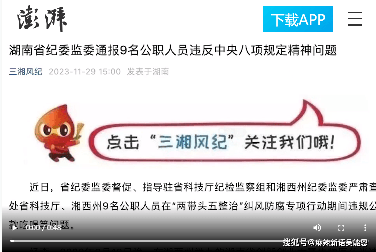 近日,湖南省纪委监委督促、指导驻省科技厅纪检监察组和湘西州纪委监委严肃查处省科技厅、湘西州 9 名公职人员在“两带头五整治”纠风防腐专项行动期间违规公款吃喝、酒后骚扰女服务员等问题。这一事件引起了社会的广泛关注,也引发了人们对公职人员廉洁自律的深思。