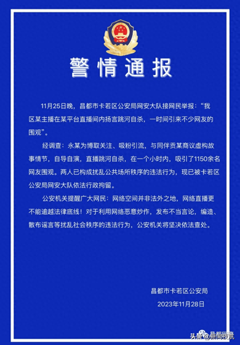 经调查:永某为博取关注、吸粉引流,与同伴责某商议虚构故事情节,自导自演,直播跳河自杀,在一个小时内,吸引了1150余名网友围观。两人已构成扰乱公共场所秩序的违法行为,现已被卡若区公安局网安大队依法行政拘留。