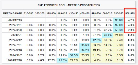 这一表述暗示美联储可能已经完成了所有加息任务,芝商所的“美联储观察”工具也显示,市场现在也认为该行进一步调高利率的概率不足5%。与此同时,互换合约预计,至少会在明年5月前执行第一次降息。