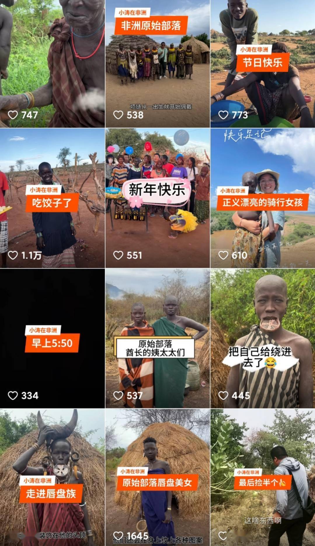 小涛本人在账号上共发布了44条短视频,“非洲的蛋糕”“非洲部落相亲现场”“走进唇盘族”“有一种美食叫木呐”……他向网友展示和介绍埃塞俄比亚的风光和人情。