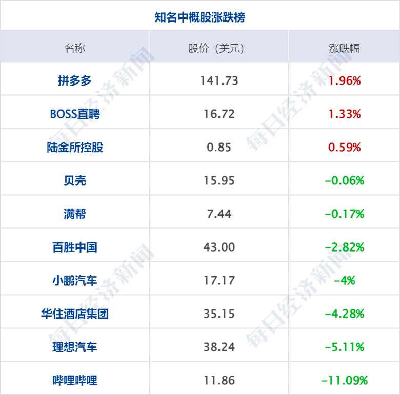 美股三大指数收盘涨跌不一,道指微涨0.04%,纳指跌0.16%,标普500指数跌0.09%,热门科技股多数下跌,Meta跌超2%,谷歌、特斯拉跌超1%。电脑硬件、资产管理、百货商店涨幅居前,流媒体、石油与天然气板块走低,道达尔、雪佛龙、埃克森美孚跌超1%。中概股普跌,纳斯达克中国金龙指数跌1.29%,哔哩哔哩跌超11%,理想汽车跌超5%,小鹏汽车跌超4%,阿里巴巴、京东跌超2%,百度跌超1%,网易、蔚来小幅下跌,拼多多盘中一度涨超4%,市值超越阿里巴巴,最终拼多多收涨近2%,最新市值1883亿美元,阿里巴巴市值1902亿美元。