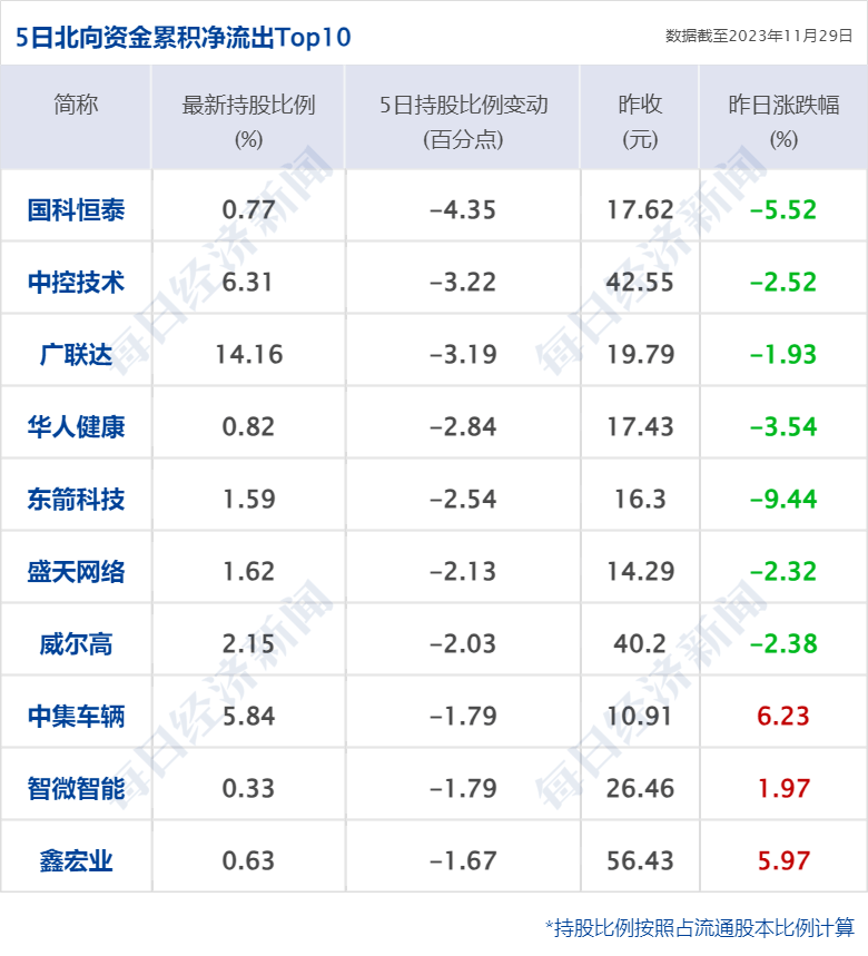 11月29日,北向资金净卖出50.80亿元。其中沪股通净卖出19.84亿元,深股通净卖出30.96亿元。北向资金成交活跃个股榜单中,净买入个股共8只,金额最多的是贵州茅台(600519.SH,收盘价:1774.71元),净买入4.334亿元;净卖出个股共12只,金额最多的是江淮汽车(600418.SH,收盘价:18.09元),净卖出2.932亿元。