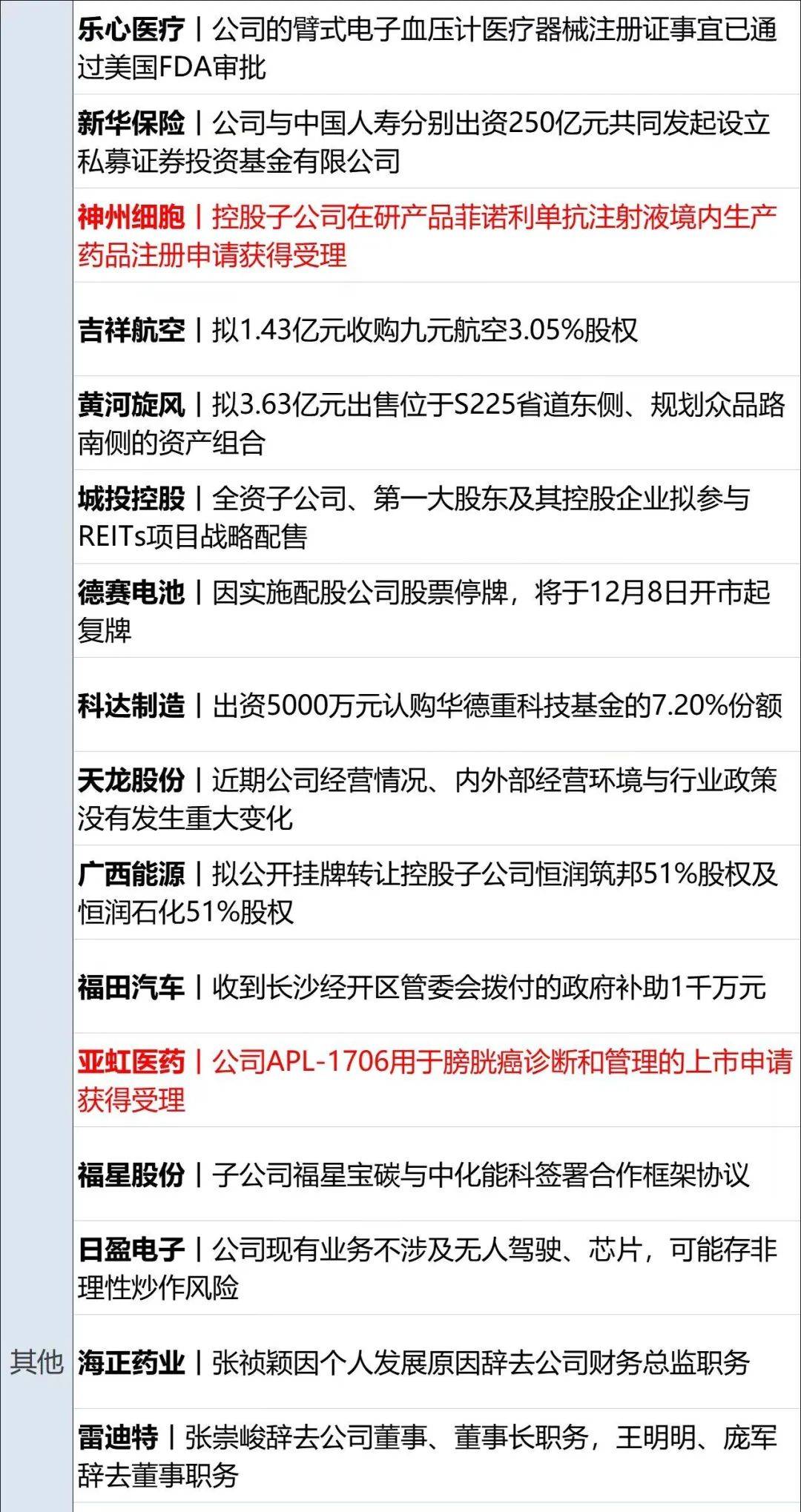NO.7中国恒大(HK03333,股价0.224港元,市值29.58亿港元):11月29日公告,公司注意到恒大物业集团有限公司,本公司的附属公司,于2023年11月28日发出的公告,内容有关其附属公司金碧物业有限公司,就其人民币20亿元存单质押担保被银行强制执行一事向包括本公司及三家相关附属公司提出追偿约人民币199,631.25万元款项及暂计利息约人民币15,206.28万元。中国恒大表示,于本公告日期,未收到中国广东省广州市中级人民法院就金碧物业提出诉讼的通知。