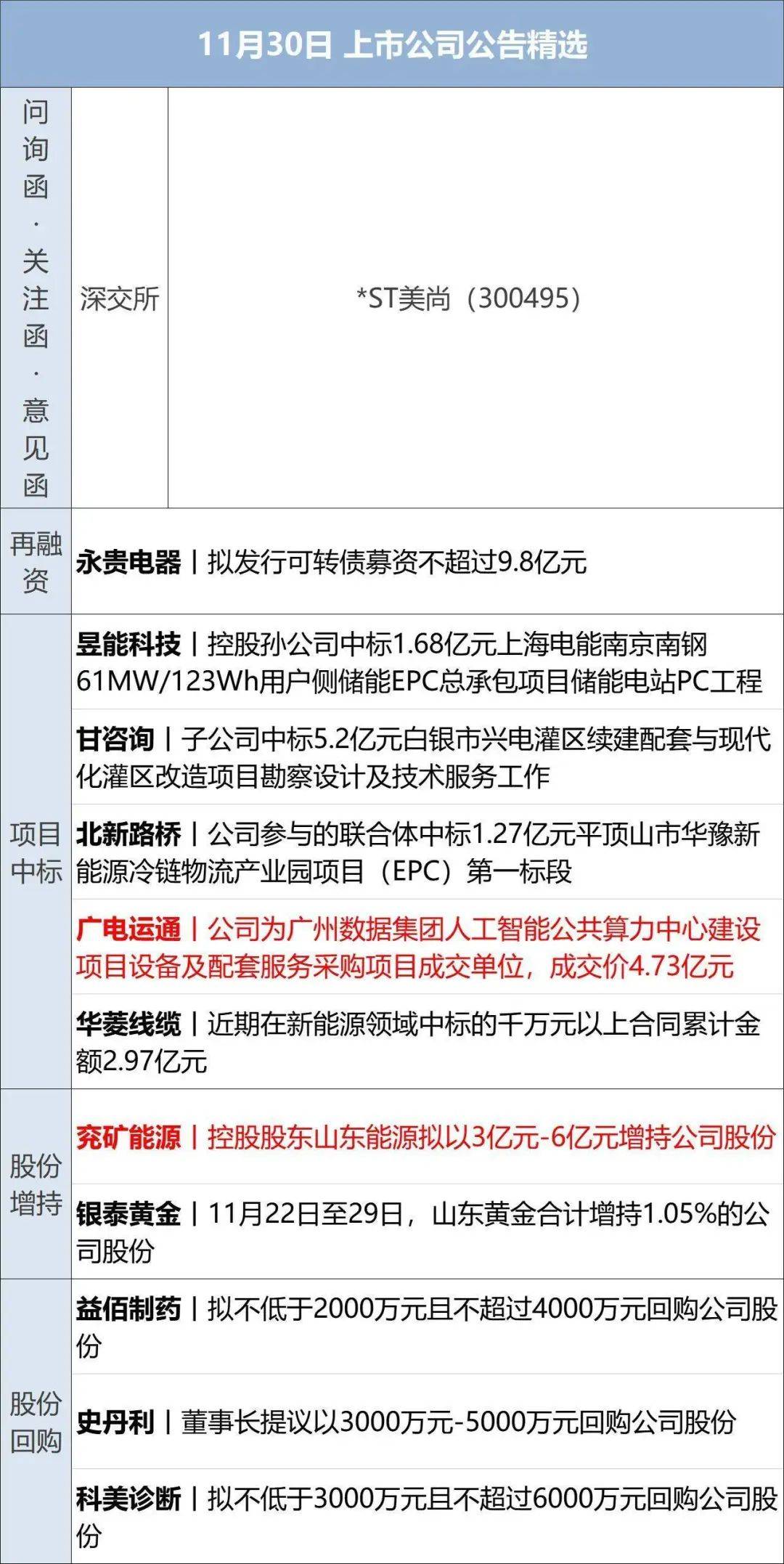 *ST天山(SZ300313,股价12.52元,市值39.18亿元):11月29日公告,近日,公司通过电话、微信等方式,均无法与公司董事长马长水取得联系,经与马长水家人沟通,截至目前,公司尚不确定无法与马长水取得联系的具体原因。