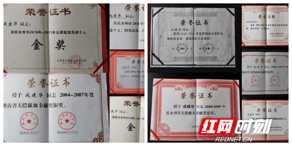 红网时刻新闻11月30日讯 成建华,男,51岁,中共党员,永州市检察院检察官,多次被单位评为先进个人、优秀党员,并5次被记三等功。工作之余,他时常扑在公益事业上,从2002年至今,累计献血74次,献血总量达29200毫升(其中献全血28次,捐献机采血小板46次),凭借着长期对献血事业的一份热忱,成建华多次荣获永州市无偿献血先进个人,湖南省和全国无偿献血奉献奖金、银、铜奖,荣获2018-2019年度“全国无偿献血促进奖个人奖”和永州市2021年度“永州好人”称号。
