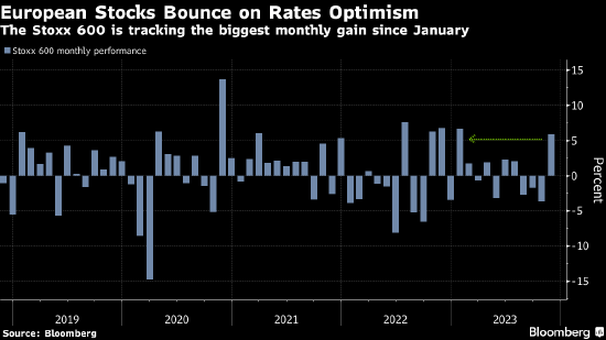 欧洲股市创下1月份以来的最大月度涨幅,因为整个地区的通胀降温刺激了风险偏好,给从房地产到科技股等板块都带来了新的上涨动力。
