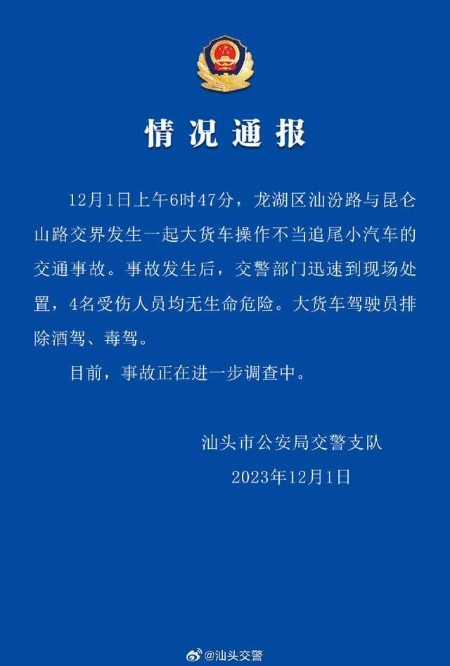 原标题:汕头交警通报一起大货车追尾小汽车事故:4名伤者均无生命危险,大货车驾驶员排除酒驾、毒驾