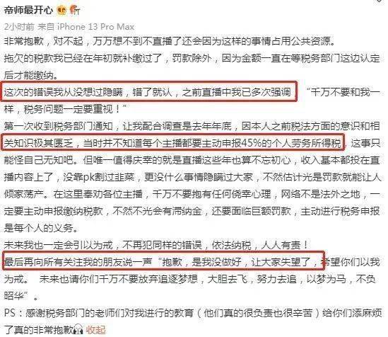 去年6月 ,“帝师”偷逃税事件被曝出之后,“帝师”在微博上发布了一封道歉信。根据道歉信可以看出,实际在2021年年底的时候,税务部门就已经在追责“帝师”偷逃税的问题。而直到2022年6月,税务部门才公开。