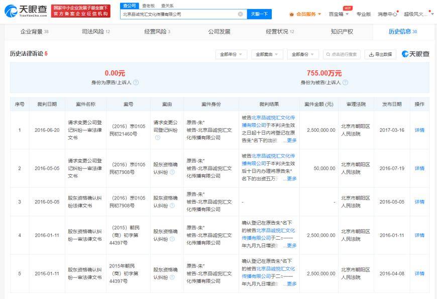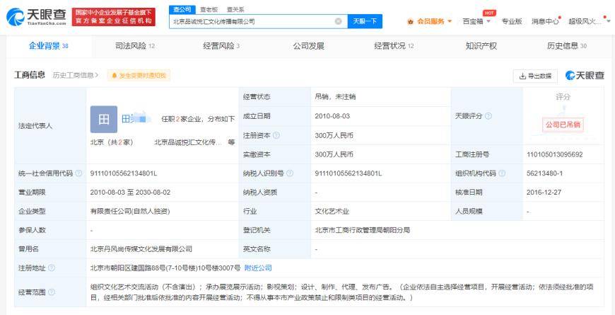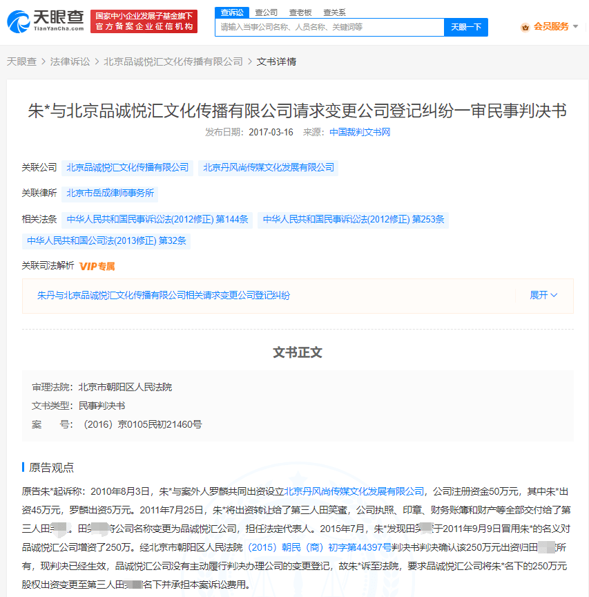 天眼查App显示,涉案公司北京品诚悦汇文化传播有限公司(曾用名:北京丹风尚传媒文化发展有限公司)成立于2010年8月,注册资本300万人民币,经营范围包括组织文化艺术交流活动、承办展览展示活动、影视策划等,由田某某担任法定代表人、执行董事、经理并全资持股,朱丹担任监事。变更记录显示,朱丹已于2016年12月退出该公司股东。风险信息显示,朱丹曾多次起诉该公司,后田某某与该公司因未支付朱丹1600万元垫付款被列为失信被执行人(老赖),并被限制高消费。