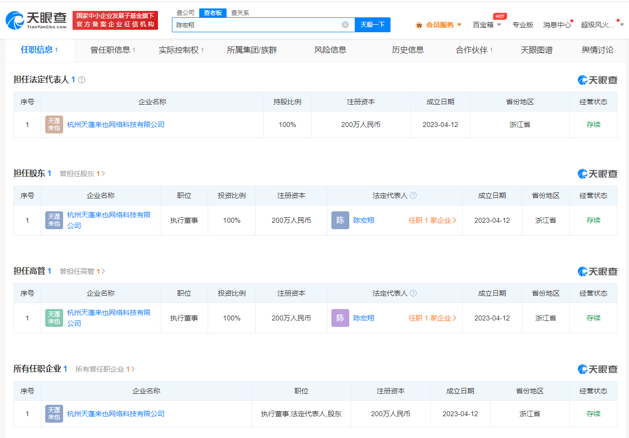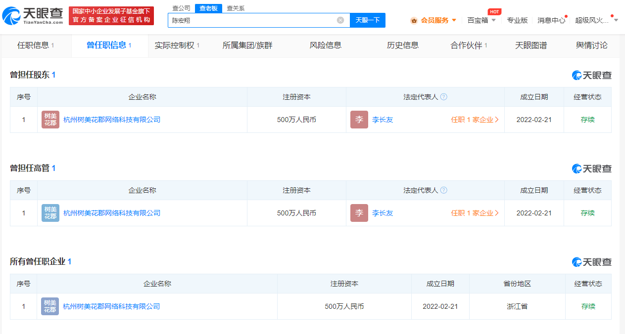 天眼查App显示,涉事公司杭州树美花郡网络科技有限公司成立于2022年2月,法定代表人为李长友,注册资本500万人民币,由李喜来、李长友共同持股。陈宏翔曾为该公司股东和监事,于今年11月10日退出。目前,陈宏翔关联一家杭州天蓬来也网络科技有限公司,该公司成立于今年4月,注册资本200万人民币,陈宏翔担任公司法定代表人、执行董事,并全资持股。