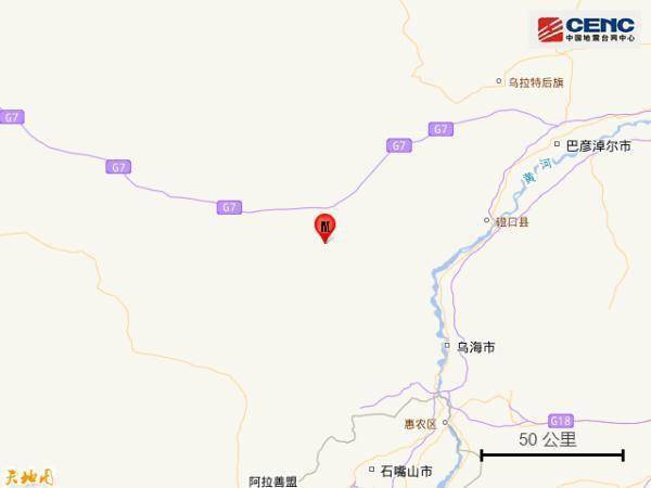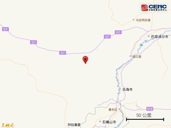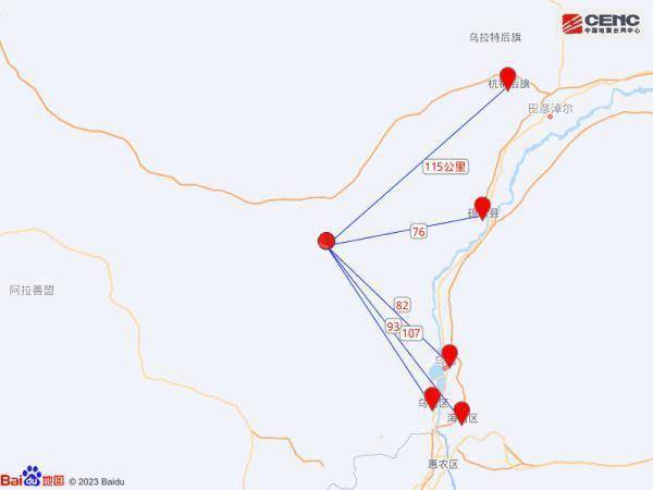 周边县城:震中距磴口县76公里、距海勃湾区82公里、距乌达区93公里、距海南区107公里、距杭锦后旗115公里,距乌海市83公里,距银川市193公里。