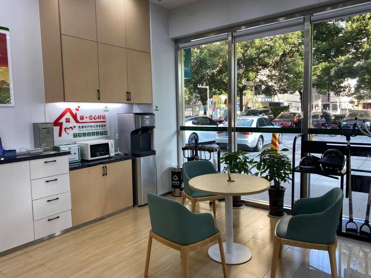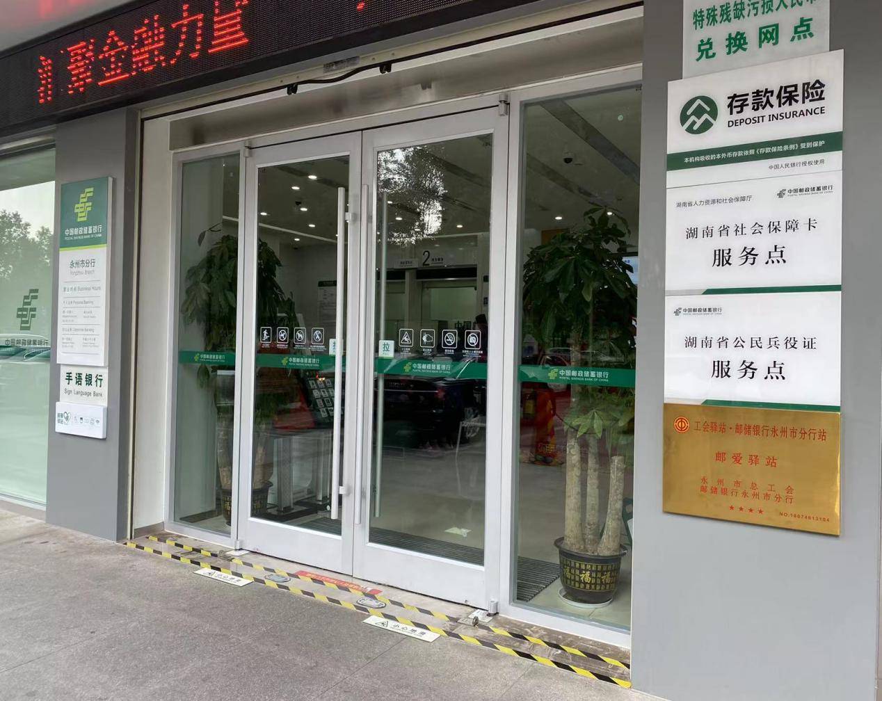 邮储银行永州市分行辖内网点在营业大厅外部、内部悬挂邮爱驿站标牌,便于户外劳动者识别和使用。