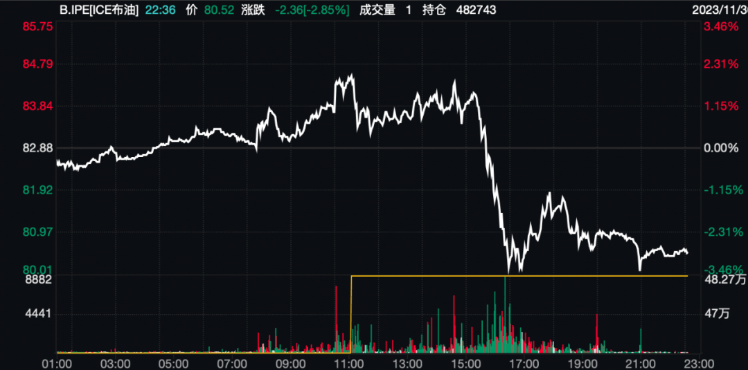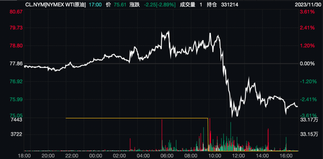 不过,隔夜油价却现大幅跳水。Wind行情数据显示,11月30日,美油、布油盘中均现大幅跳水,由涨转跌。截至收盘,ICE布油大跌2.85%,NYMEX WTI原油大跌2.89%。