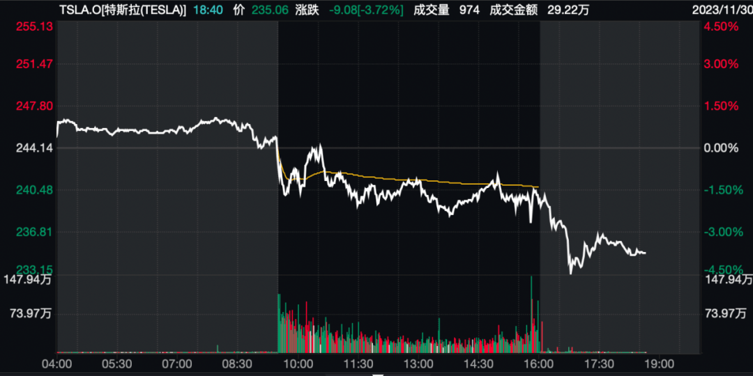 在发布会结束后,特斯拉尾盘一度跳水,跌幅扩大至约3%。尽快快速收回部分跌幅,当截至收盘,特斯拉仍跌1.7%。盘后,特斯拉股价持续走低,一度跌超3%,截至发稿,盘后跌约2%。