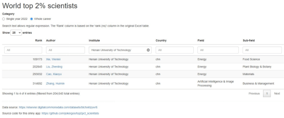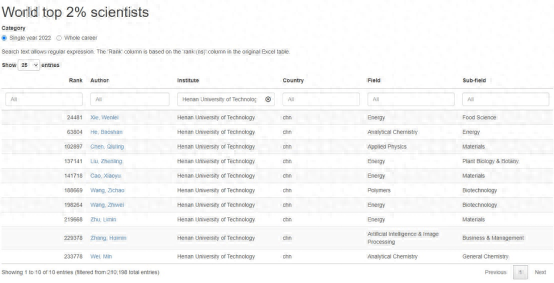 河南工业大学多位学者入选全球前2%顶尖科学家榜单