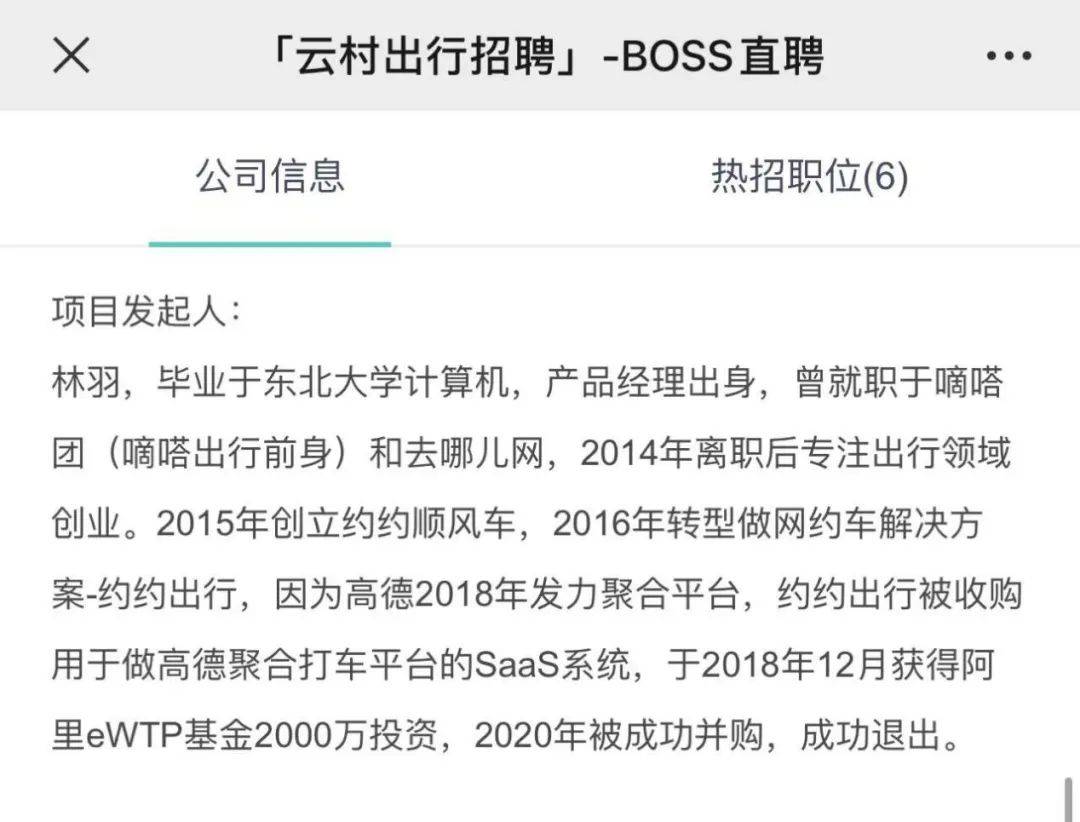 约约出行创立于2015年,2016年转型做网约车解决方案。创始人林羽,也是云村出行的发起人。据云村出行在“BOSS直聘”的介绍,因为高德2018年发力聚合平台,约约出行被收购用于做高德聚合打车平台的SaaS系统,并于2018年12月获得阿里eWTP基金2000万投资,2020年被成功并购,成功退出。