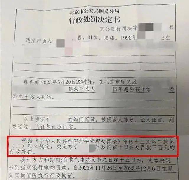 王女士提供的北京市公安局顺义分局11月26日出具的行政处罚决定书显示,现查明,2023年5月20日22时许,在北京市顺义区某小区,违法行为人因不想要孩子,给王女士喝的水中溶入药物。