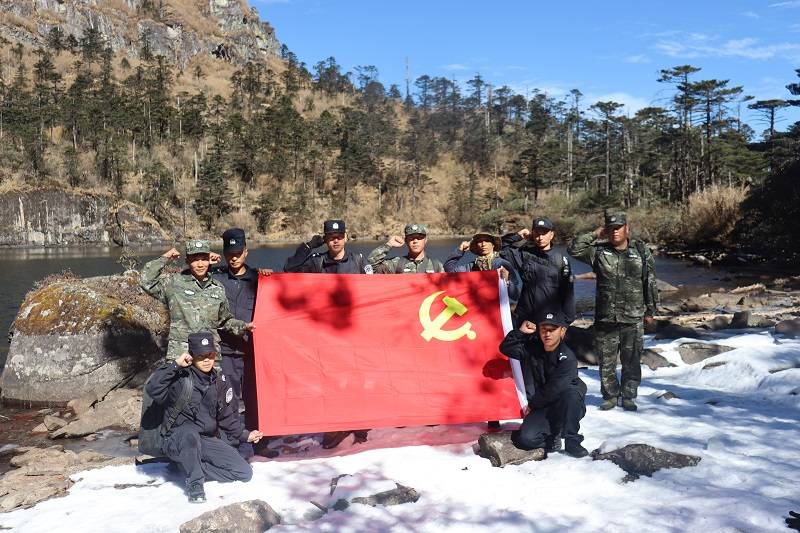 接下来巡逻的路途非常艰难,一会儿钻进茫茫竹海,一会儿踏入冰冷河流、一会儿步入原始丛林,很多高山陡坡处,队员们需要手脚并用才能攀爬上去,山路陡峭,烈日炙烤,没一会儿,队员们的衣衫就被汗水浸湿,他们却习以为常。在队员们相互帮衬下,历经8个小时终于到达美丽的然更扒湖。