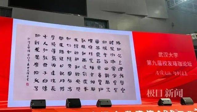 “飒爽金秋,珞珈鹭岛。犹忆当年进课堂,诸生有幸列门墙。《武汉大学颂》的原件我送给了曾文涛学长,感谢他为胡国瑞奖学金捐资100万元,母校的恩情我们永远不会忘记。我衷心祝愿亲爱的母校越来越好。”