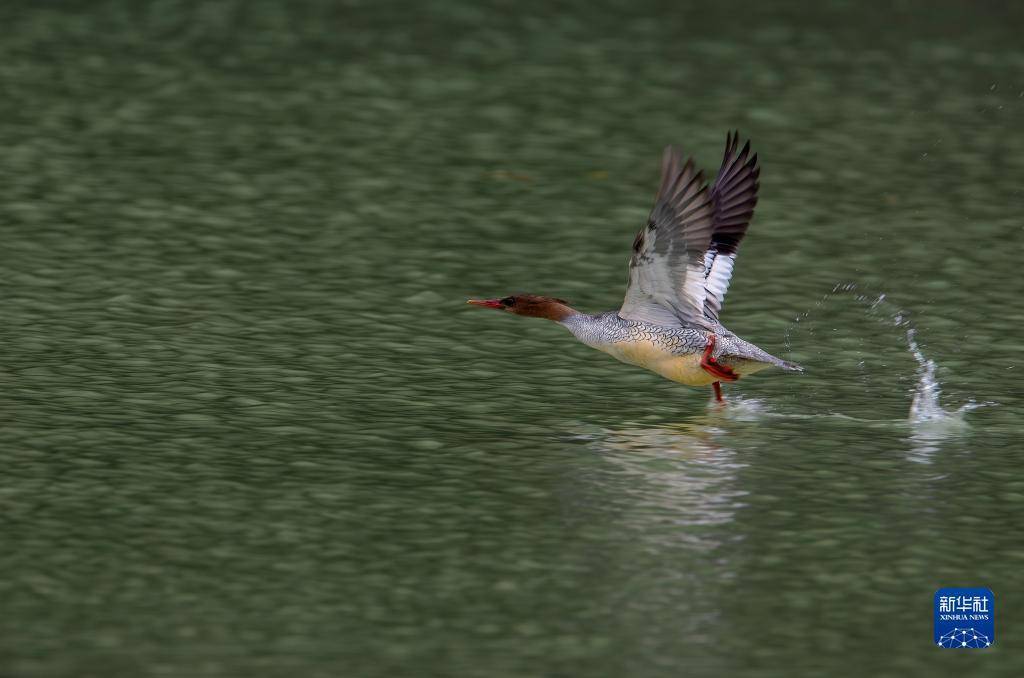 在永泰县嵩口镇梧埕村大樟溪,一只中华秋沙鸭振翅飞行(11月29日摄)。