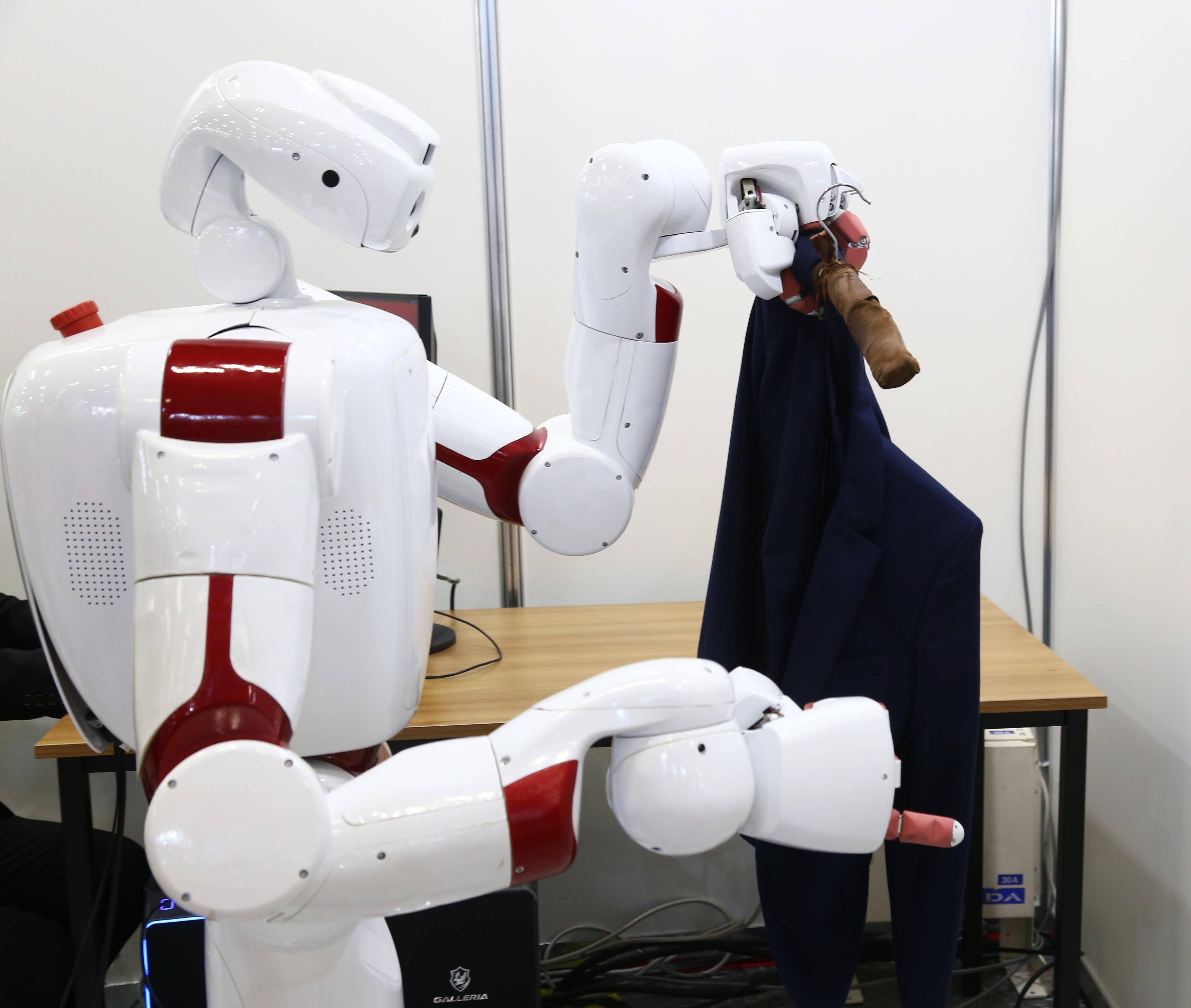 11月30日,在日本东京举办的日本国际机器人展上,早稻田大学的机器人展示往衣架上挂衣服。 新华社记者 钱铮 摄