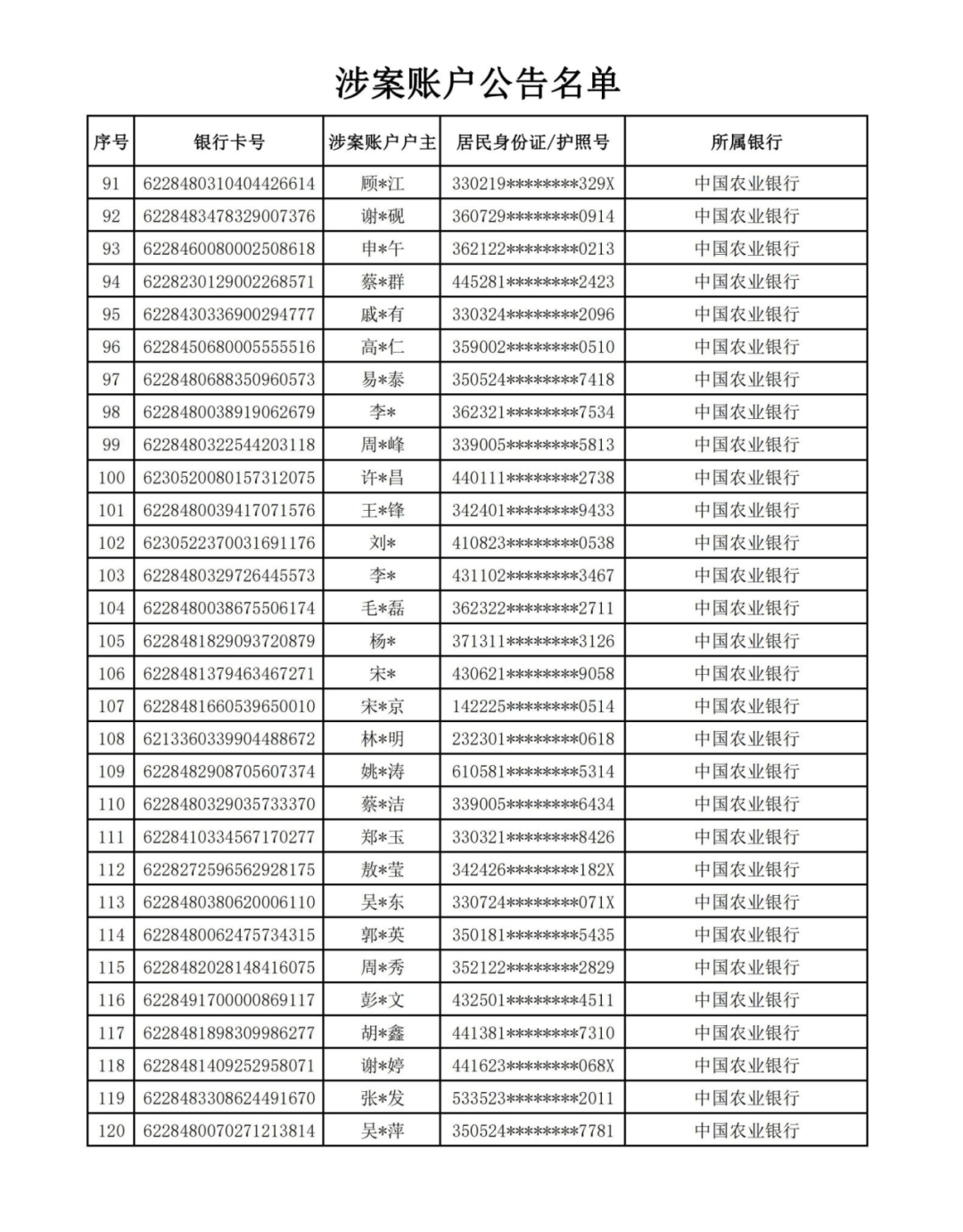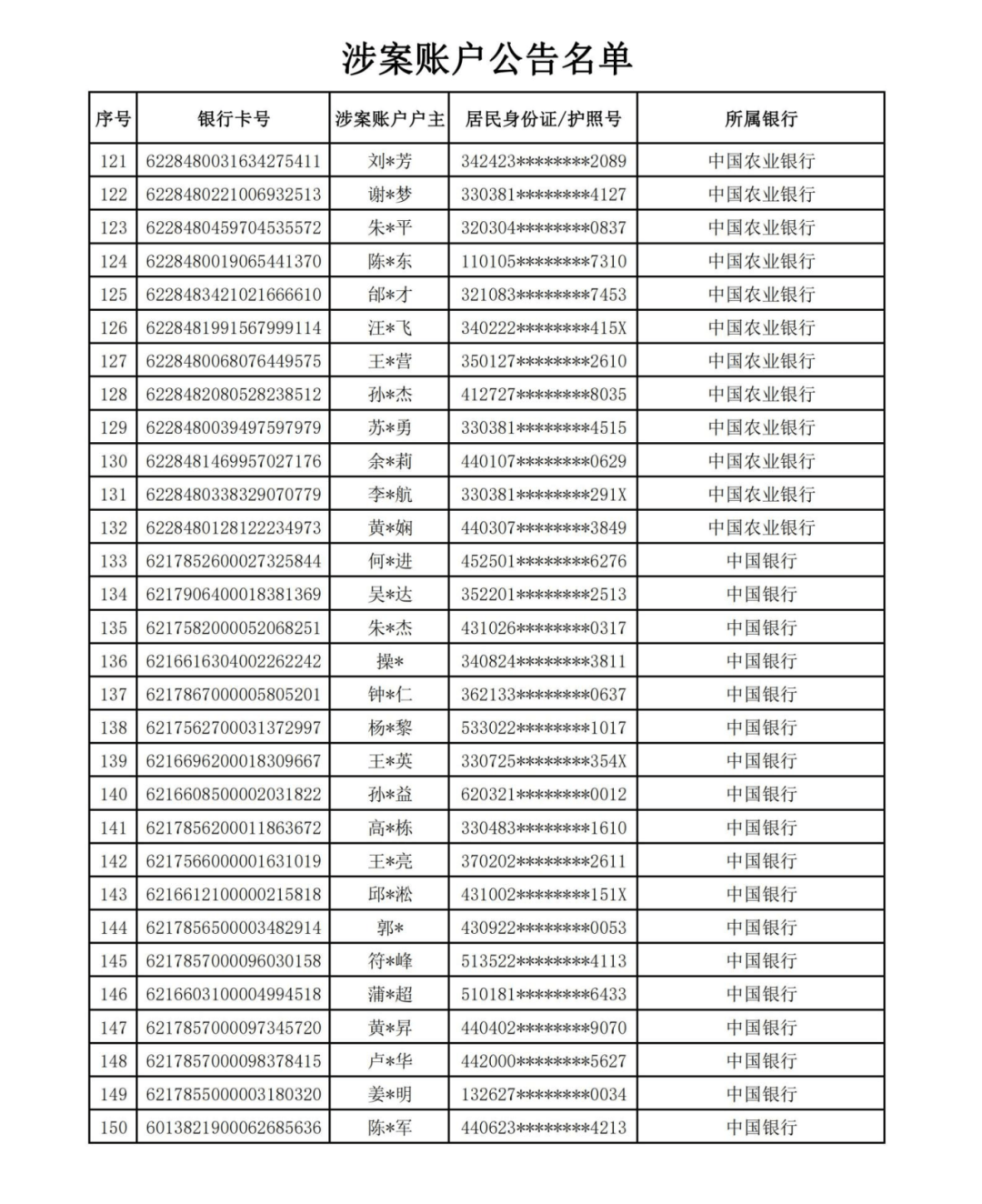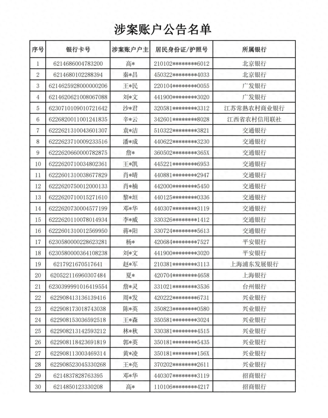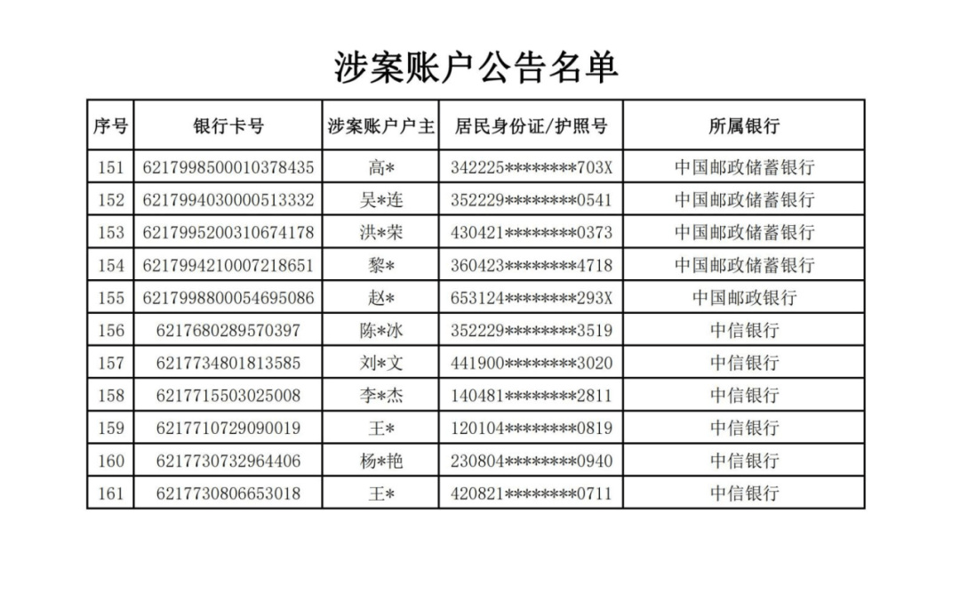 四、公告账户的权利人、利害关系人涉嫌犯罪、帮助他人犯罪或者帮助他人逃避法律责任等违法犯罪情形的,将予以追究相应的法律责任。