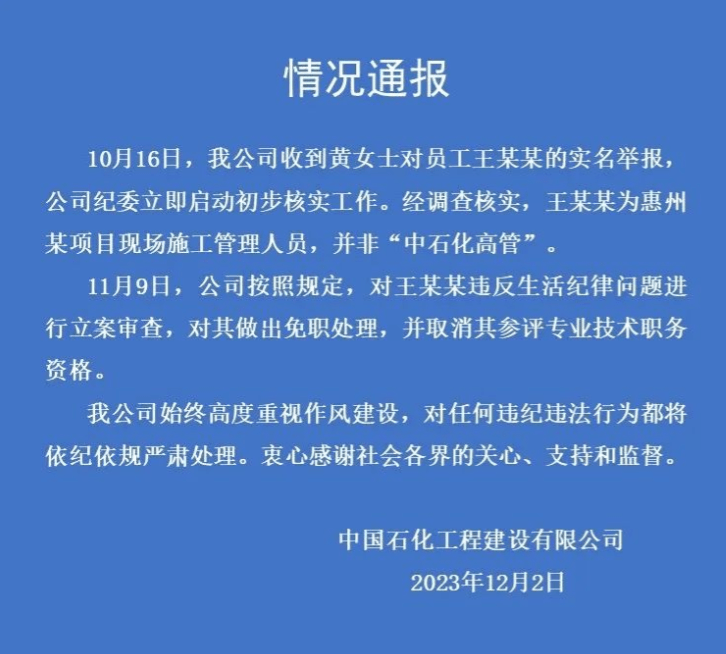 情况通报称,10月16日,中国石化工程建设有限公司收到黄女士对员工王某某的实名举报,公司纪委立即启动初步核实工作。经调查核实,王某某为惠州某项目现场施工管理人员,并非“中石化高管”。11月9日,公司按照规定,对王某某违反生活纪律问题进行立案审查,对其做出免职处理,并取消其参评专业技术职务资格。