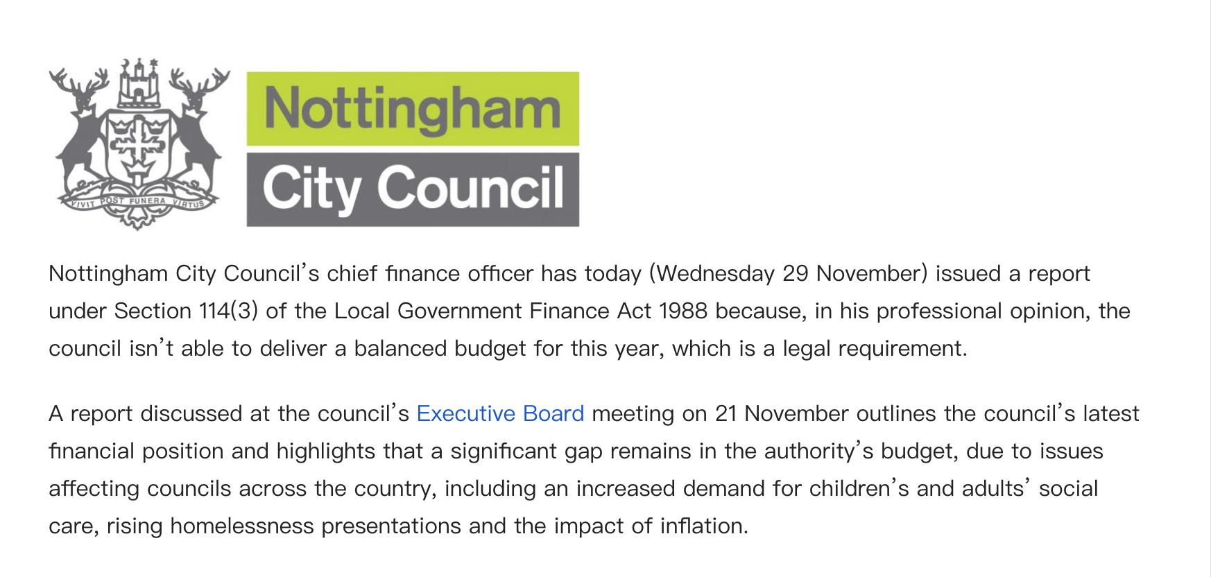 11月29日,诺丁汉市政委员会宣布,该市“今年无法实现法律规定的平衡预算”,已根据《1988年地方政府财政法》第114条发布了通知。