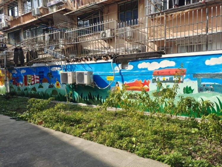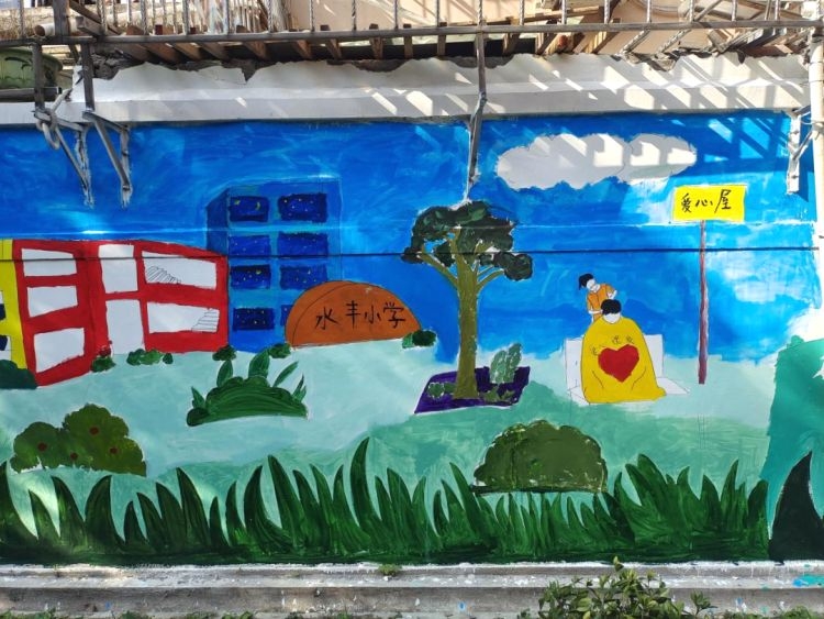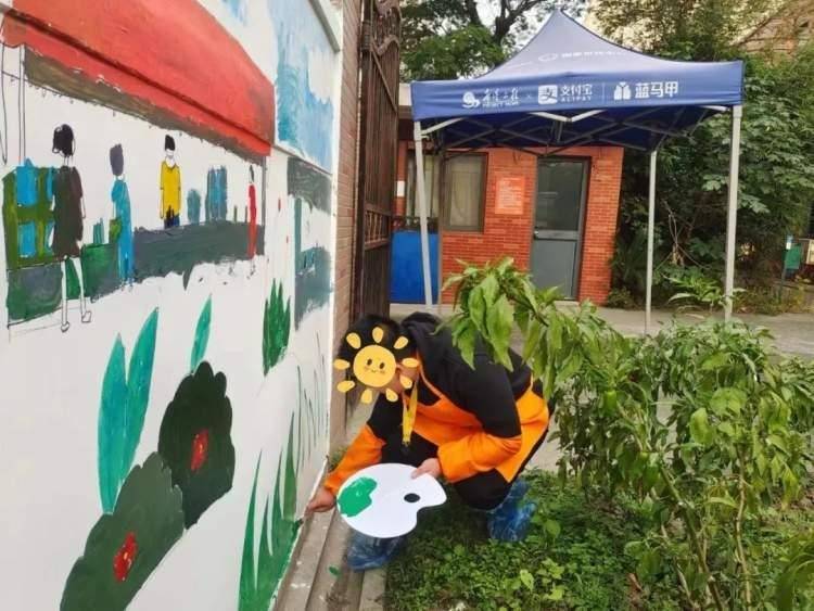 位于延吉社区第二睦邻中心内这片原本荒芜一片的空地占地大约80平方米,原本墙面发霉掉漆,在上期微改造活动中已进行了墙面粉刷翻新。本次微改造利用该处的整面白墙,由同济大学城市360团队的学生设计了公益主题墙画,绘画内容围绕延吉水丰路公益一条街,从小木屋市集到吉爱亭,从水丰路小学到水丰路锅贴……个个都是延吉社区公益地标、网红打卡点。