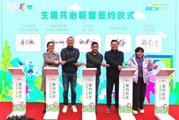 随后,来自愚三、岐山、万村居民区的志愿者代表们以拼图形式发布了街道护绿团队logo“绿境灵”,西园大厦居民代表发起了生境共建倡议。此外,江苏路街道社联会、愚园街区共治联盟、愚园路第一小学、鼎植集团、乐酷公益共同参与生境共治联盟签约,为生境艺术街区共治赋能。