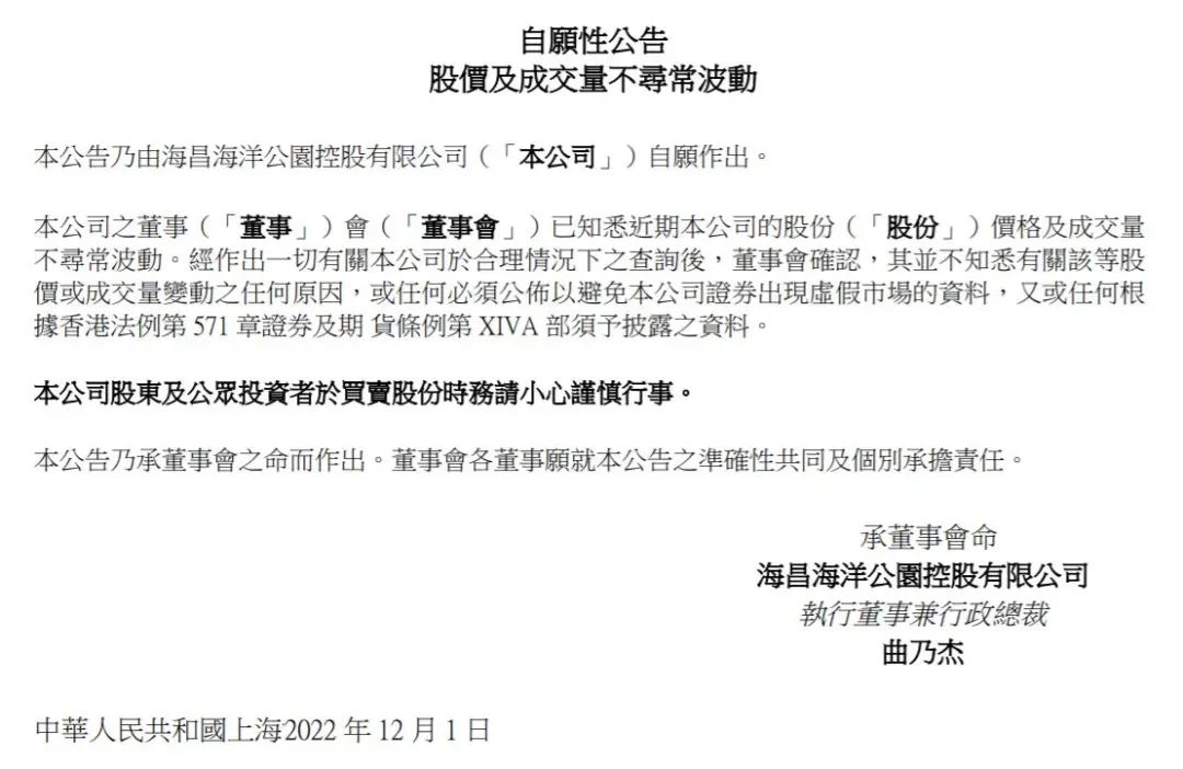 12月1日午后,在股价突发不明原因的暴跌后。海昌海洋公园控股有限公司(以下简称“海昌海洋公园”)发布公告称,董事会不知悉有关股价或成交量变动的任何原因,也没有任何相关的需要披露的资料。