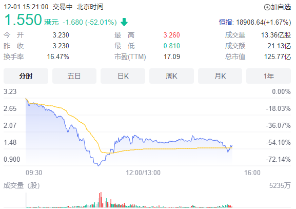 截至发稿,海昌海洋公园的股价跌52.01%,报1.55港元/股,最新市值125.77亿港元。