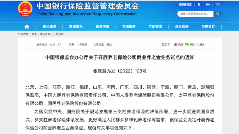 12月1日,银保监会官网发布《中国银保监会办公厅关于开展养老保险公司商业养老金业务试点的通知》(以下简称《通知》),决定自2023年1月1日起,在北京市、上海市、江苏省、浙江省、福建省、山东省、河南省、广东省、四川省、陕西省等10个省(市)开展商业养老金业务试点。试点期限暂定一年。
