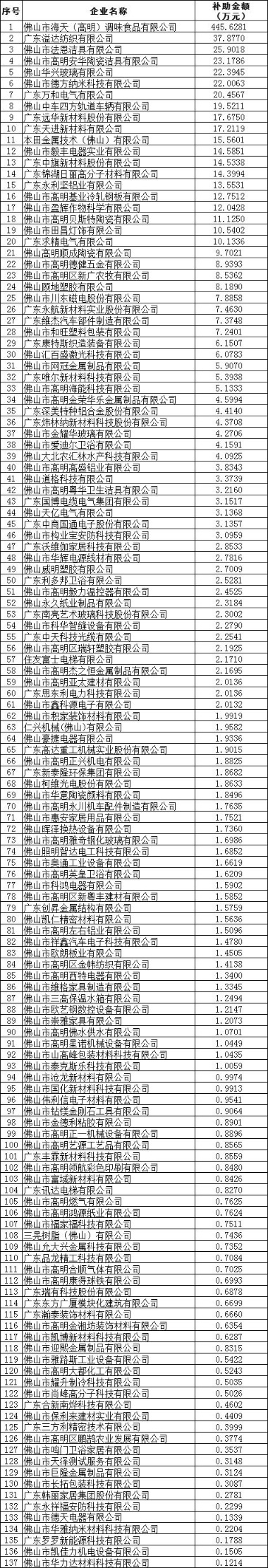 近日,佛山市科学技术局关于2022年高新技术企业研发费用后补助资金安排公示。据悉,佛山市高明区137家企业拟获得相关补助,补助数额最高的是佛山市海天(高明)调味食品有限公司,有望拿到补助445.6万元。目前佛山市高明区高新技术企业存量为312家,对比2021年增长25.8%,增长势头强劲。