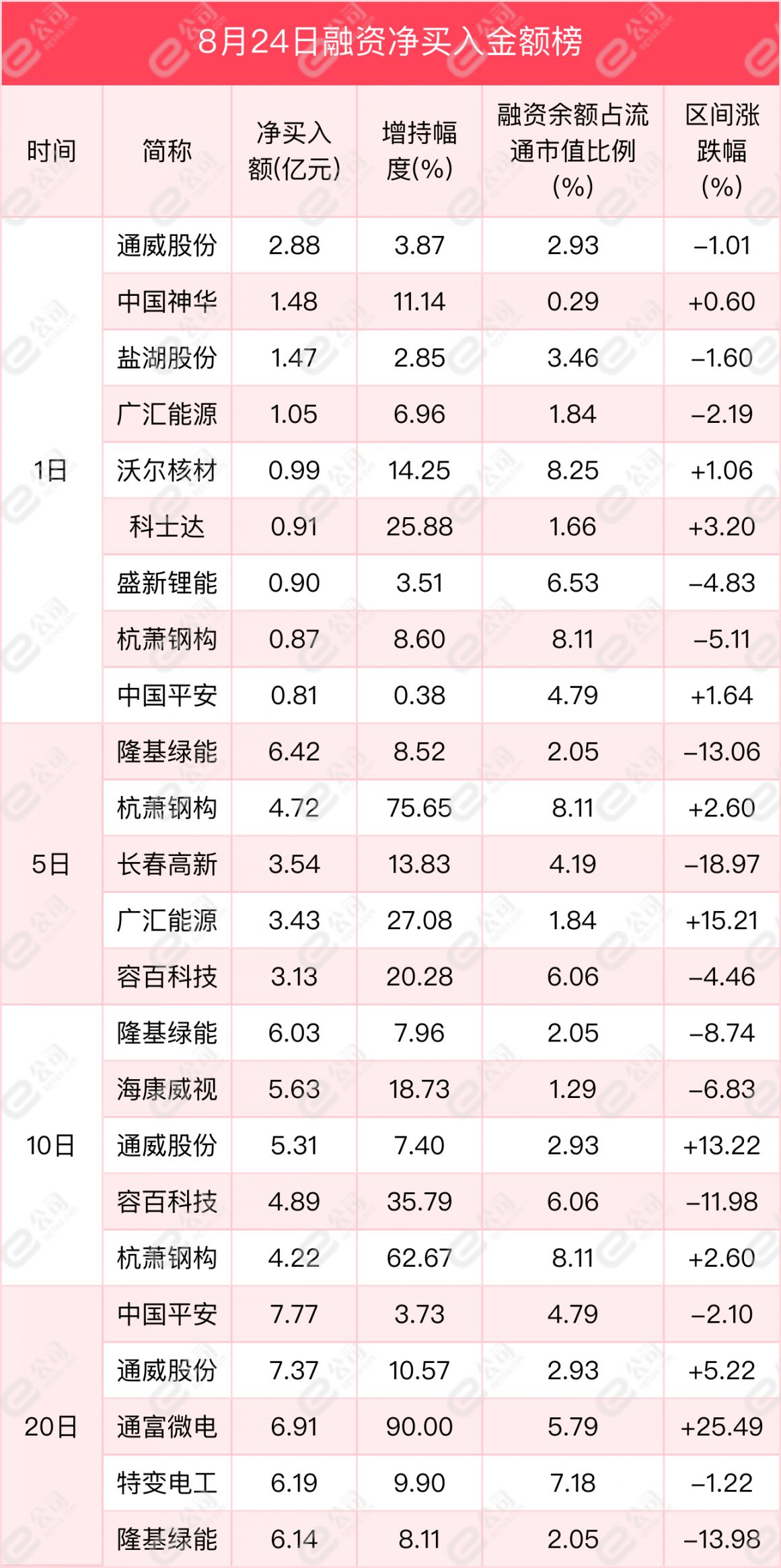 从买卖金额来看,通威股份、中国神华、盐湖股份获融资净买入金额居前,分别为2.88亿元、1.48亿元、1.47亿元,增持幅度分别为3.87%、11.14%、2.85%。