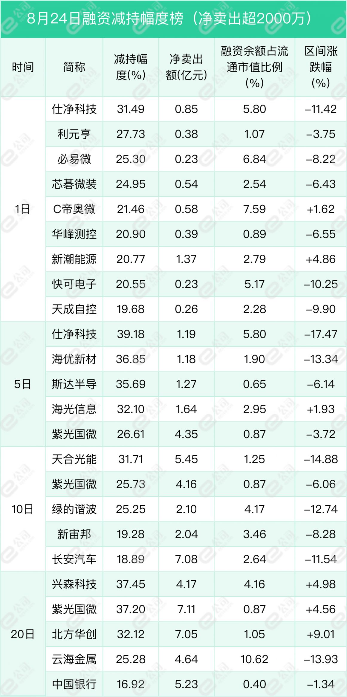 仕净科技、利元亨、必易微遭融资减持幅度居前,分别为31.49%、27.73%、25.3%。