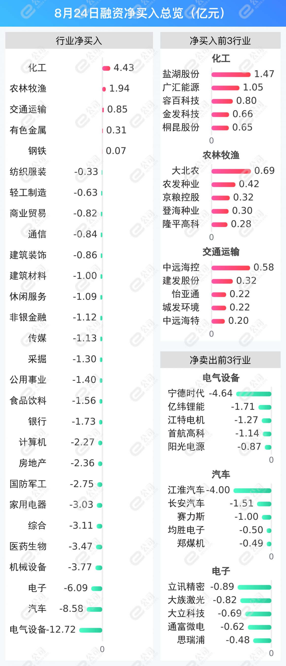 化工、农林牧渔、交通运输获融资净买入金额居前,分别为4.43亿元、1.94亿元、0.85亿元。