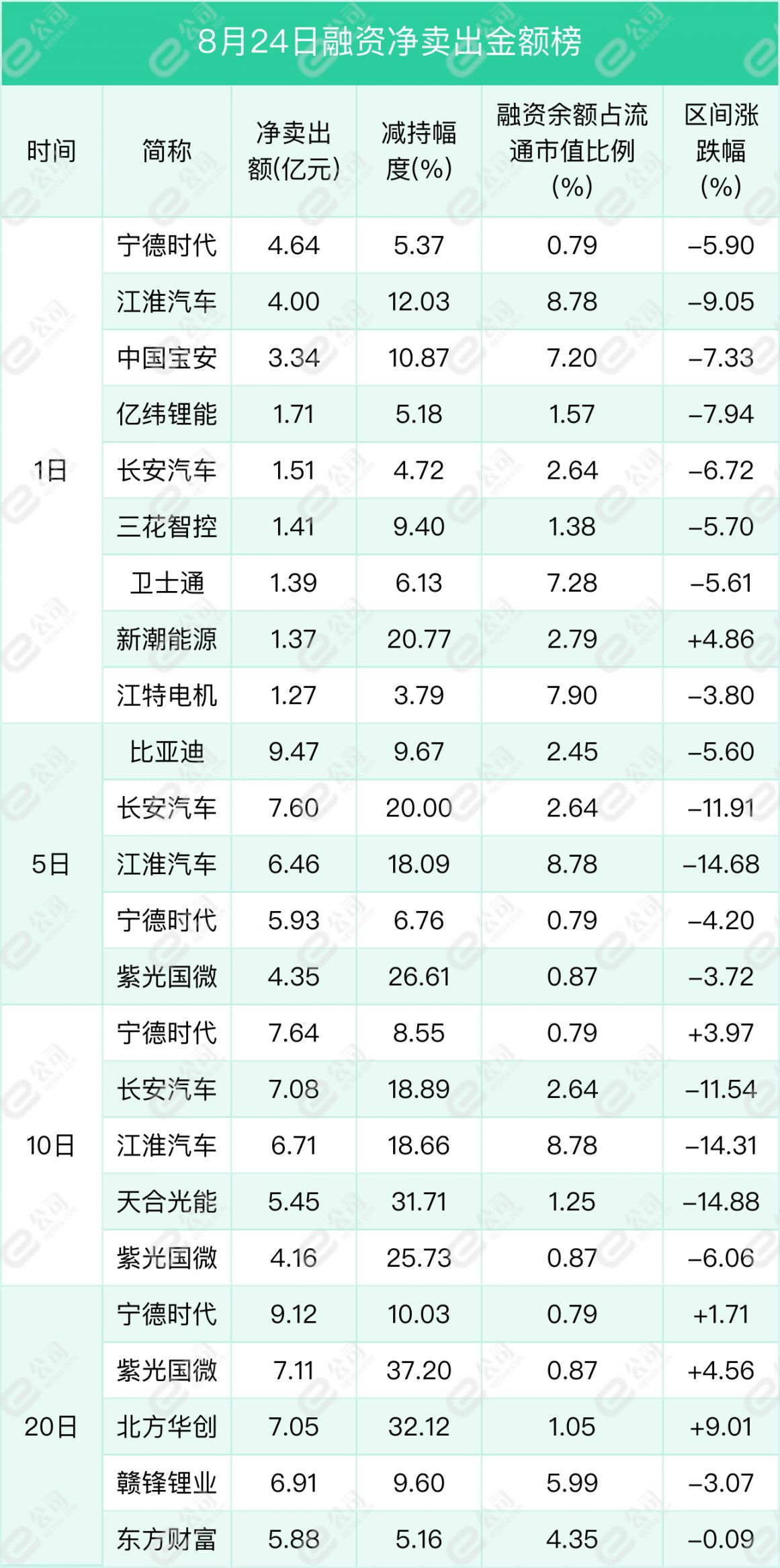 宁德时代、江淮汽车、中国宝安遭融资净卖出金额居前,分别为4.64亿元、4亿元、3.34亿元,减持幅度分别为5.37%、12.03%、10.87%。