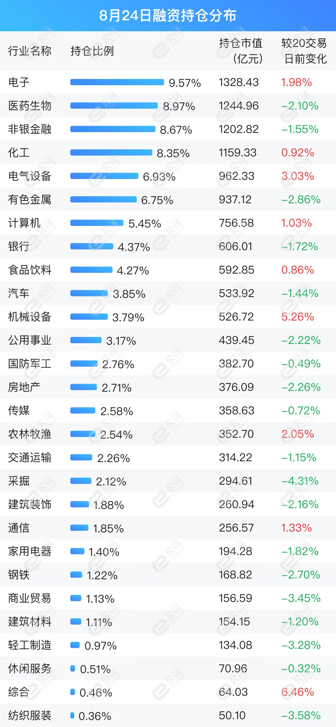 e公司数据统计显示,截至8月24日,融资持仓市值前五行业为电子、医药生物、非银金融、化工、电气设备,占持仓总市值42.49%。