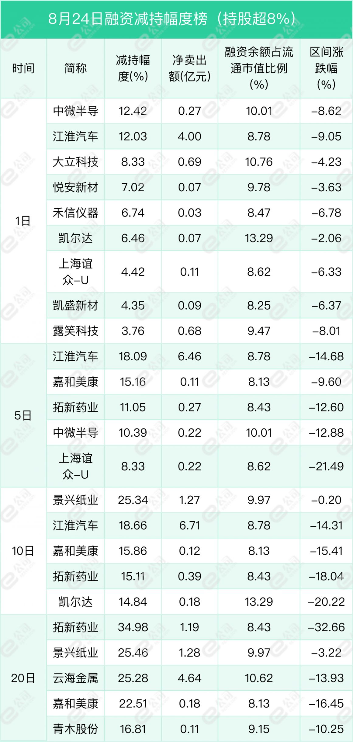 中微半导、江淮汽车、大立科技遭融资减持幅度居前,分别为12.42%、12.03%、8.33%。